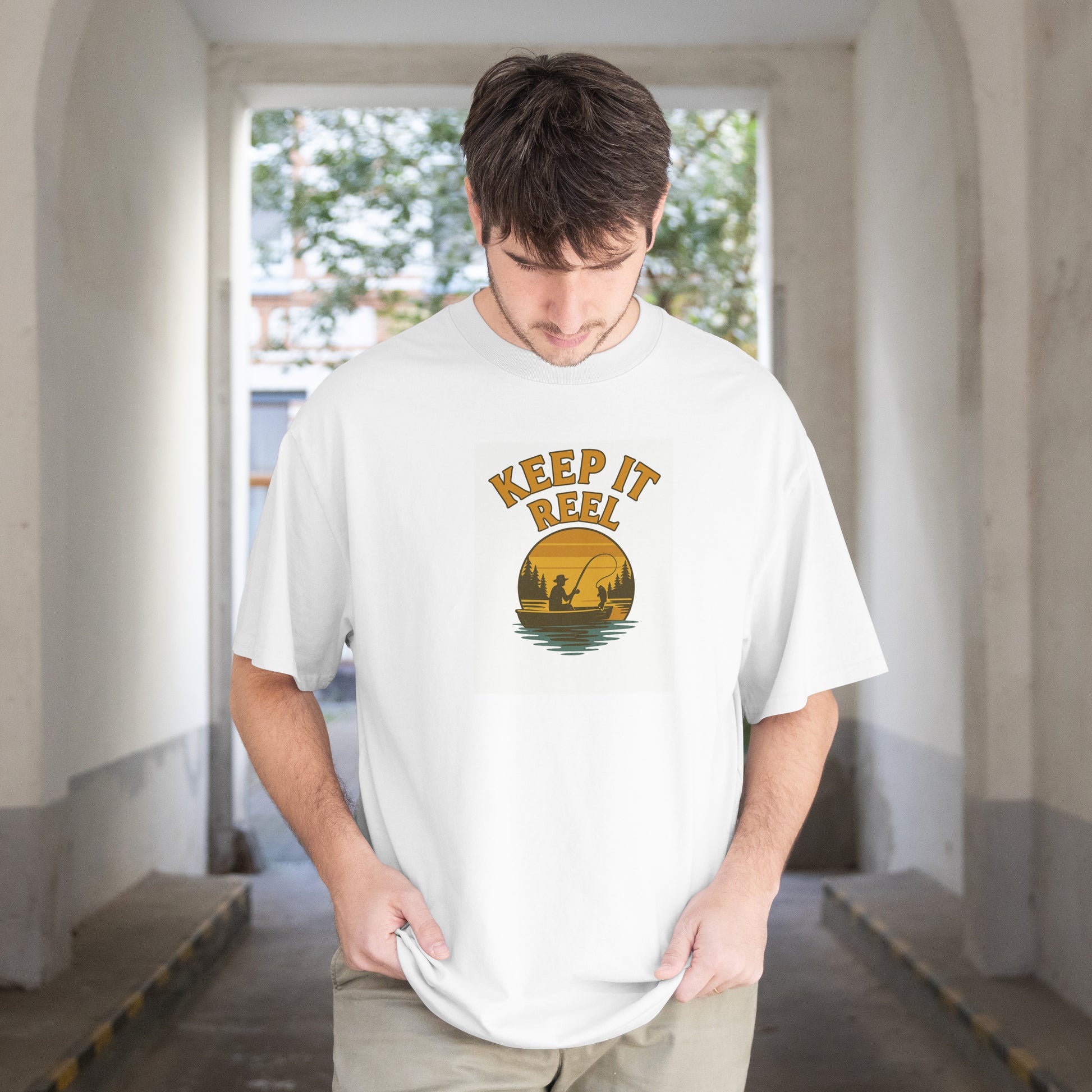🌅 Design: Retro sunset fishing graphic with “Keep It Reel” typography